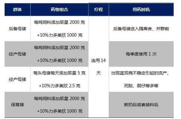 替米考星的作用:針對藍耳病的藥物不是很多,因為其獨特的感染靶細胞,即巨噬細胞,尤其是肺泡巨噬細胞。替米考星穩定藍耳病的首選藥物,1)在吞噬細胞中靶向聚集;2)伴隨吞噬細胞向感染部位趨化性轉移;3)替米考星從吞噬細胞中釋放后殺菌。因為替米考星在豬體內的生物學分布具有高度的靶向聚集性,肺泡巨噬細胞內的藥物濃度是血中濃度的50~75倍。 依靠替米考星的堿性基團,改變了巨細細胞內pH,可有效干擾PRRSV的復制,因而可顯著降低血中的病毒載量,降低排毒量,并且顯著減輕因藍耳病造成的流產、弱仔、木乃伊以及生長豬的呼吸道疾病。同時,替米考星具有抗炎(抑制中性粒細胞壞死,誘導其凋亡)、調節免疫。抗菌等作用。替米考星的使用方案:母豬群:不一定表現“流產風暴”,當出現死胎、木乃伊、弱仔、泌乳降低、仔豬成活率偏低時,要考慮藍耳病的影響。為了使后備母豬更穩定,需要在進隔離舍時添加替米考星。母豬群:每噸飼料添加辰星(替米考星)2000克+10%的力多美欣(鹽酸多西環素)1000克,連用14天。每月每季度使用1次,或豬群不穩定時使用1次。每頭后備母豬:每天添加辰星(替米考星)4克+力多美欣2克,連用14天;或每頭經產母豬每天添加辰星5克+力多美欣2.5克,每季度一次,每次連用2天。保育豬則常因轉群應激、免疫空白期、和混群交叉感染而易發病:保育豬每噸飼料添加辰星(20%替米考星預混劑)2000克+10%力多美欣1000克,在斷奶后或者換料后連續使用2周,可降低死亡率和僵豬比例,提升均重。由于替米考星具有顯著的抗菌效果,因而該方案在保育豬的使用,可顯著降低副豬嗜血桿菌病、鏈球菌病的發病率和死亡率。
