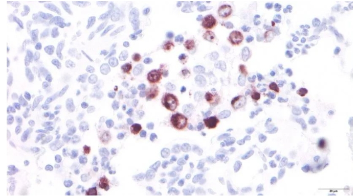 排列在肺泡上的上皮細(xì)胞由兩種類型的細(xì)胞組成,稱為I型和II型肺泡細(xì)胞(圖2)。 I型肺泡細(xì)胞是扁平的細(xì)胞,覆蓋了肺泡的大部分表面,氣體可以很容易地通過(guò)它們的細(xì)胞質(zhì)。II型肺泡細(xì)胞單獨(dú)或在I型肺細(xì)胞中呈小群分布,主要分布在與肺泡間隔相連的邊緣。它們的形態(tài)從圓形到立方體不等,自由表面有少量微絨毛。它們的細(xì)胞質(zhì)含有細(xì)胞器,稱為板層體或細(xì)胞體。 細(xì)胞體在肺泡表面分泌一種表面活性劑物質(zhì),與水分子混合,降低水分子的凝聚力,從而降低肺泡液體的表面張力,防止肺塌陷,促進(jìn)更小的吸氣努力,使肺泡容易充滿空氣。這些細(xì)胞具有分裂分化為I型肺泡細(xì)胞的能力,是細(xì)胞更新的主要來(lái)源。肺泡壁中心由間質(zhì)占據(jù),間質(zhì)具有連接性,支持廣泛的毛細(xì)血管網(wǎng)絡(luò)吻合。 圖2: 肺泡壁示意圖 肺泡巨噬細(xì)胞是另一種重要的肺臟防御機(jī)制。除了位于肺泡腔內(nèi)的肺泡巨噬細(xì)胞外,我們還可以發(fā)現(xiàn)位于毛細(xì)血管內(nèi)的血管內(nèi)肺泡巨噬細(xì)胞,以及位于間隔間質(zhì)中的間質(zhì)巨噬細(xì)胞(圖2)。 前者通過(guò)吞噬微生物和吸入的顆粒來(lái)保護(hù)肺泡腔,而后者則負(fù)責(zé)清除通過(guò)血流到達(dá)肺部的顆粒或病原體。肺泡巨噬細(xì)胞群是炎癥介質(zhì)的主要生產(chǎn)者,如細(xì)胞因子和趨化因子,也可以由其他細(xì)胞類型分泌。這些分子的主要功能是將中性粒細(xì)胞和淋巴細(xì)胞等炎癥細(xì)胞吸引到損傷(或感染)部位,從而在參與炎癥過(guò)程的細(xì)胞之間充當(dāng)“通信系統(tǒng)”。 豬繁殖與呼吸綜合征病毒(PRRSV)等病毒的主要靶細(xì)胞是肺泡巨噬細(xì)胞(圖3),它們改變了肺泡巨噬細(xì)胞的基本功能(吞噬、抗原呈遞和細(xì)胞因子產(chǎn)生),并導(dǎo)致它們最終死于壞死和/或凋亡,這調(diào)節(jié)了免疫反應(yīng),使有效適應(yīng)反應(yīng)的出現(xiàn)延遲,從而有利于繼發(fā)感染的出現(xiàn)。 圖3:PRRSV感染的肺泡巨噬細(xì)胞 我們不能忘記,肺泡是呼吸交換發(fā)生的地方,與外界有接觸,因此上皮纖毛的完整性和肺泡巨噬細(xì)胞的功能是維持呼吸功能穩(wěn)態(tài)的基礎(chǔ)。