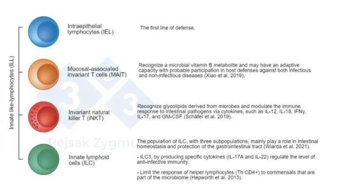 圖2. 在GALT中,我們可以區(qū)分出幾個關(guān)鍵的群體:先天類淋巴細胞(ILL)位于小腸,在較小程度上位于大腸,作為細胞因子、細胞毒分子和抗菌肽的生產(chǎn)者發(fā)揮重要作用(Hepworth et al., 2013;Sch?fer等,2019;Wiarda等人,2020;Wiarda等人,2021;肖等人,2019)