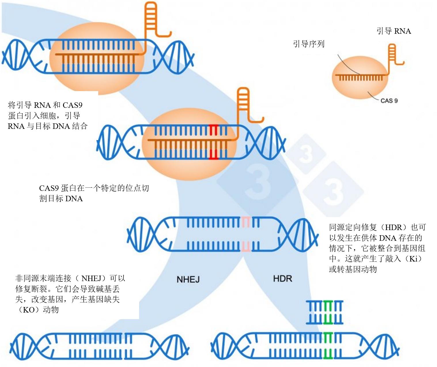 基因編輯的另一種選擇是利用DNA被Cas9切割時引入新的DNA鏈。這樣,細胞就可以通過一種稱為同源定向修復(HDR)的過程來整合這種新的遺傳物質(圖1)。這允許有缺陷的DNA序列被功能性的DNA序列所取代,糾正基因使其再次發揮功能,或改變閱讀框以創建一個基因已失活的基因敲除動物。此外,這項技術還可以將以前沒有的新基因插入到生物體的基因組中,稱為敲入(KI)或轉基因。