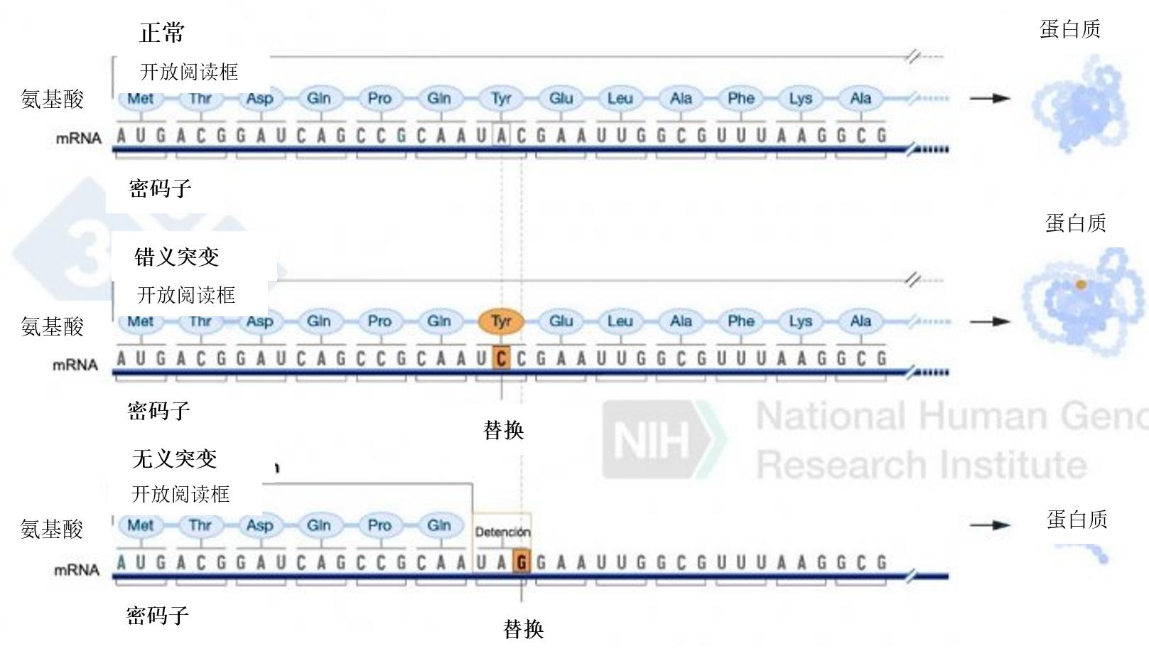 圖2. 一個核苷酸插入的例子,涉及到閱讀框的改變,導致與正常情況不同的氨基酸形成,最后一個終止密碼子阻止了該蛋白質更多氨基酸的形成。